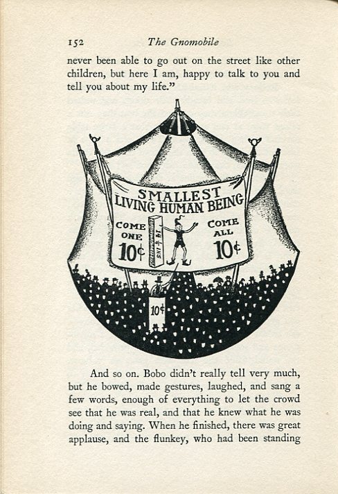 All this time, they have found no new gnomes. Glogo becomes more and more distraught, while Bobo is having the time of his life learning about the big people. The time comes when Rodney must hold another press conference about the supposed goslings, which he claims have been donated to an undisclosed farm. However, at about the same time, a showman, who wants to purchase the goslings, tricks Elizabeth into leaving the gnomes unattended, and they are gnome-gnapped.From there, the book becomes a mystery. Rodney and Elizabeth employ a pair of private detectives, Mr. Smith and Mr. Guggins, who they take into their confidence. They're on the trail, when the showman begins to advertise "the most marvelous spectacle ever offered in the history of mankind."