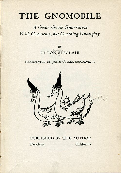 When he finished graduate school in 1900, however, Sinclair wanted to focus on becoming a "serious" artist. He sequestered himself in a cabin in Quebec and set out to write his first adult novel. For Sinclair, writing children's stories was a thing of the past, outgrown. Soon he was a social reformer whose fiction led to legislation, like the first Food and Drug Act.But having grandchildren can change a man. 1933 saw the birth of Sinclair's grand-daughter Diana. Much of the next two years were spent on his third campaign for governor of California, but when he lost the election, Sinclair set out on a speaking tour that took him through the redwood forests of northern California and Oregon. It was there that he decided he would attempt a children's novel, dedicated to Diana: The Gnomobile, A Gnice Gnew Gnarrative With Gnonsense, but Gnothing Gnaughty.