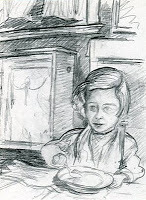 Cummings showed little reaction to the December 20, 1919 birth of his daughter Nancy Thayer. His work was always more important. It wasn't until October 1920 that Cummings had any involvement with his daughter. Thayer and Elaine were planning to divorce, and so Cummings and Elaine renewed their relationship. They saw each other on a daily basis, which meant time with daughter Nancy, who he called Mopsy. By summer of 1921, the little family was living in Paris, although at separate establishments. Elaine led a wealthy life, and the poor Cummings refused to live off of her or Thayer's money. Still, he began to play with Nancy (see his sketch of her to the left), taking her on walks and to the park. His relationship with Elaine grew ever closer, even though they continued to live and travel separately. And he told Nancy stories.
