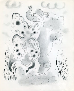 The second story is "The Elephant & The Butterfly." "Once upon a time there was an elephant who did nothing all day." He lives in a small house at the top of a hill, down which there is a long winding road that leads to another small house "in which a butterfly lived." One day the elephant is sitting at home when he sees a figure making its way up the hill towards his house. It is the butterfly, who stands at the door and asks if anyone is home. He asks three times before the elephant answers and lets him in. It rains while the elephant and butterfly are safe inside, and when the rain stops "the elephant put his arm very gently around the little butterfly and said: 'Do you love me a little?'...And the butterfly smiled and said: 'No, I love you very much.'" They decide to go on a walk, and walk down the long winding path to the butterfly's house. When they get there, "the butterfly said: 'Why didn't you ever before come down into the valley where I live?' And the elephant answered, 'Because I did nothing all day. But now that I know where you live,I'm coming down the curling road to see you every day, if I may--and may I come?' Then the butterfly kissed the elephant and said: 'I love you,so please do.'" The elephant keeps his promise, "And they loved each other always."