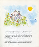 The third story is "The House That Ate Mosquito Pie." Reminiscent of Virginia Lee Burton's masterpiece The Little House, Cummings house is forgotten, abandoned, and lonely. No one will live in him or play in him. "There was the afternoon,of course;but the afternoon rarely came near the house because the afternoon was too busy putting the moon to bed. And there was the night,too;but the night was fondest of wandering and wandering among all the bright and gentle kinds of flowers which you and I call 'stars' because we don't know what they really may be." One day the house hears beautiful singing. He loves the singing and has a sense it is meant for him. A small flying person appears. It is a bird. "Nobody can suppose how happy the house was when all at once the tiny flying person alighted right beside him and said: 'May I come to live in you?'" The house knows at last why he has been lonely and gives an emphatic yes. He sets about cleaning himself up, winding his clocks and washing his windows. And the bird sings. They decide to celebrate over a mosquito pie, but when the bird leaves, she finds there are people who are coming to try to live in the house. Once the people come in to look around, all of the clocks go off "with such a banging and a crashing as you never heard." The people are frightened away. The bird and house make their celebratory mosquito pie. "Not only that--but no people ever bothered them any more,and so they were as happy together as happy could be."