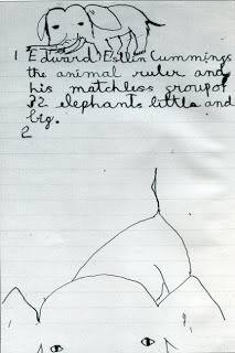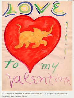 To fully understand the next story in the narrative, it is important to know that Cummings considered the elephant his totem. As a child he was a fan of animal stories, particularly those of Rudyard Kipling, and he came to associate the elephant with his father who carried him about and had big ears. At some point the role reversed and Cummings saw himself as the elephant. He drew elephants repeatedly in his youth (the drawing above is from one of his six-year-old sketchbooks), and throughout his life would sign personal letters with an elephant sketch (the Valentine to the right is to his third wife Marion).