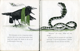 When Mrs. Crow returns from the store, she gives the snake a long lecture about eating other people's eggs. "Since that time, Mrs. Crow has successfully hatched out four families of seventeen children each. And she uses the snake as a clothesline on which to hang the little crows' diapers."