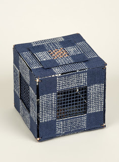 For the boxes, McCurdy wires the ‘woven’ tiles together and embellishes them with coloured computer wire, metallic thread, raffia or other textile symbols such as the spiral, used by women over the centuries.