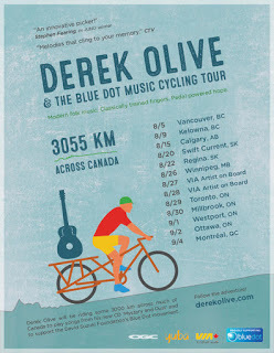 What does a guitar, a bike and an olive have in common? This August singer songwriter Derek Olive embarks on a 10-city, 3000km music cycling tour in support of the David Suzuki Foundation's Blue Dot movement. With a Masters in Music and as an Emergency Room nurse, Olive isn't just driven, he's pedal powered to make a change.
