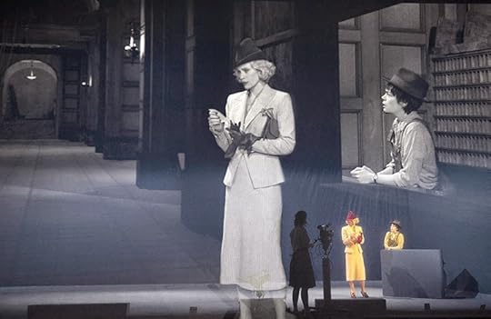 Featured prominently in Helen Lawrence is a blue-screen enclosed stage on which the play itself is performed. This allows for the actor’s images to be shown alongside computer generated 3-D buildings that are recreations of Vancouver’s skyline from 1948. Filmed and live images of the actors are projected into detailed and fully furnished virtual spaces with the story unfolding simultaneously as both a film and a play.