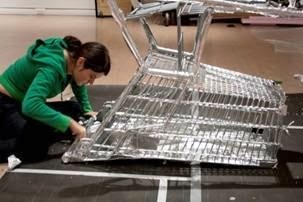 Shopping Cart (2004-2014): A series of delicate sculptural tracings of shopping carts created by intricately cutting and embossing aluminum foil.