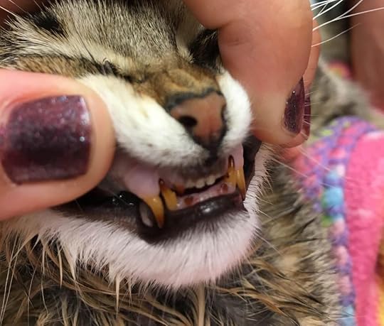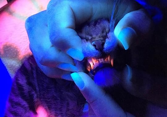 “The teeth look stained in regular light and they glow in blacklight,” she explained. “The kitten could eat regularly as far as I could tell.” Allwein, an animal lover, also runs her dog’s Instagram.