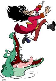 The villain in Peter Pan is a pirate. Now Captain James Hook honestly looks a little hilarious, with his goofy hat and Jay Leno chin and twitchy mustache. His melodramatic temper tantrums and physical terror of the crocodile are also kind of funny. It's hard to take him seriously.