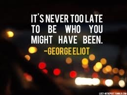 So when Mary Ann Evans tells me that it's never too late for me to be who I might have been, she lifts me from the inactive despair of believing that my opportunities have passed me by long ago. I believe her, because she lived what she said. She died at the age of sixty having made her mark on the world. If I live only that long, I want to spend every day of the twenty-two years left to me doing what I love. I want to open my eyes to the world. I want to connect with the valuable, individual human beings around me. I want to choose my innermost desires. I want to wow the Muse. I want to do all that is in my heart. It's never too late to start.