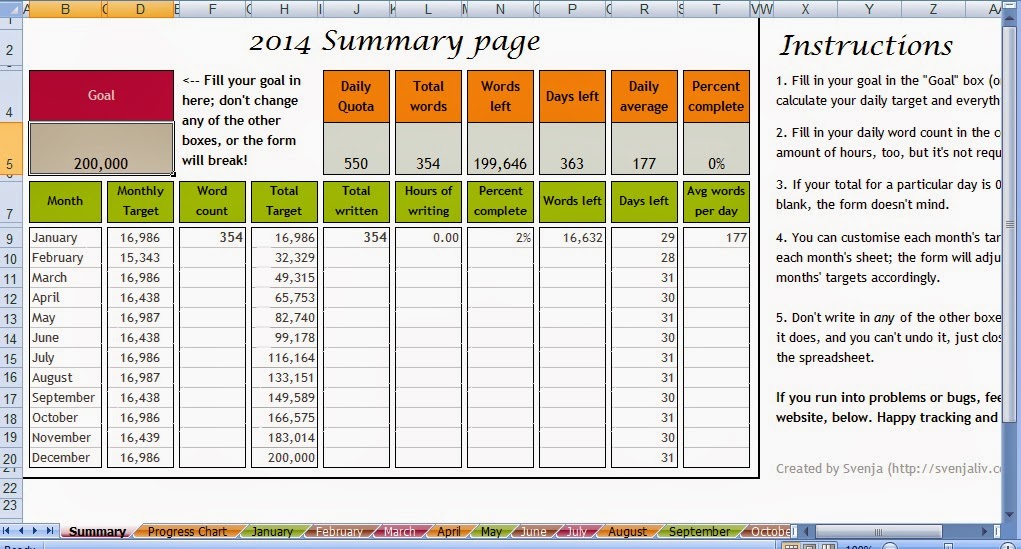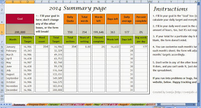 I've taken a spreadsheet created by Svenja. It maps number of words written each day and matches to your target for the month/year. I use similar spreadsheets for various things at my day job so this should be really easy for me to maintain for my writing. The formulas are easy enough but it's nice to have someone else create the worksheet and share it. That's a lot of work the wonderful Svenja has saved me.