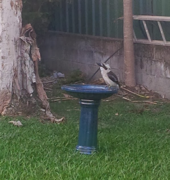 My clothesline is on the kookaburra's regular rounds of his territory, but this is only the second time I've seen him at the birdbath. If you look closely, you'll see he's a blue-wing kookaburra, not a laughing kookaburra. The blue-wings don't laugh: they cackle.