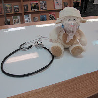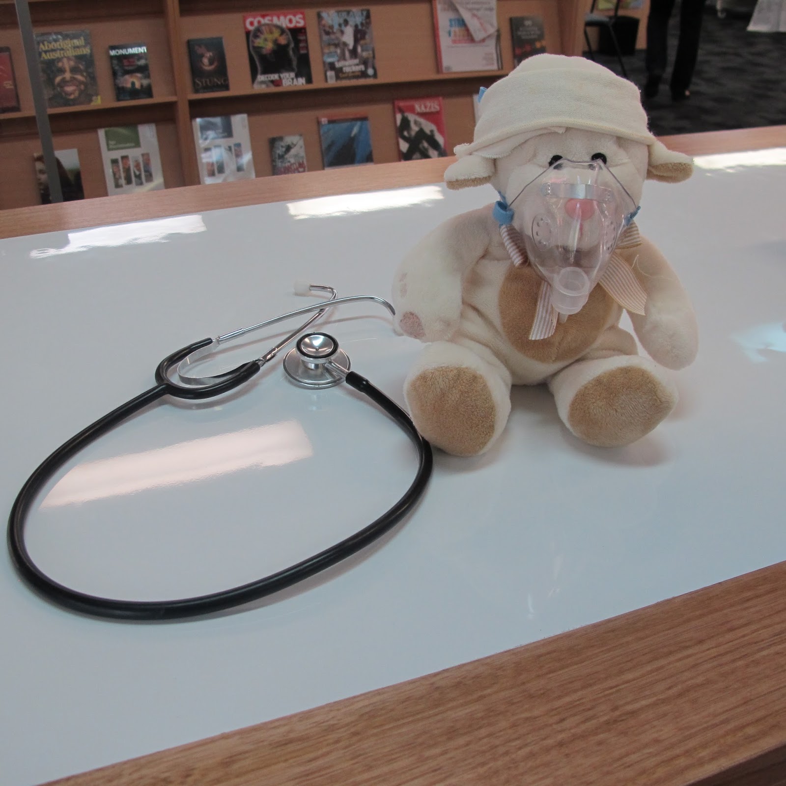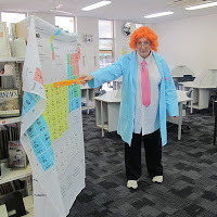 It's science week. In my life, that's cause for celebration and costumes. I've spent the first few days of the week as various types of scientist. There was the mad scientist in blue lab coat, pink tie and orange hair, the super-serious scientist who wore opaque tights and sensible shoes and a jet black bob. All day at work colleagues stopped to look twice, not realizing it was me. Funny, they didn't have the same trouble when I was the mad scientist. Then there was the modern day scientist in jeans and t-shirt with orange protective eyewear and a beaker full of nifty orange stuff. These things must be colour-matched. My assistant came as a doctor, complete with patient on oxygen.