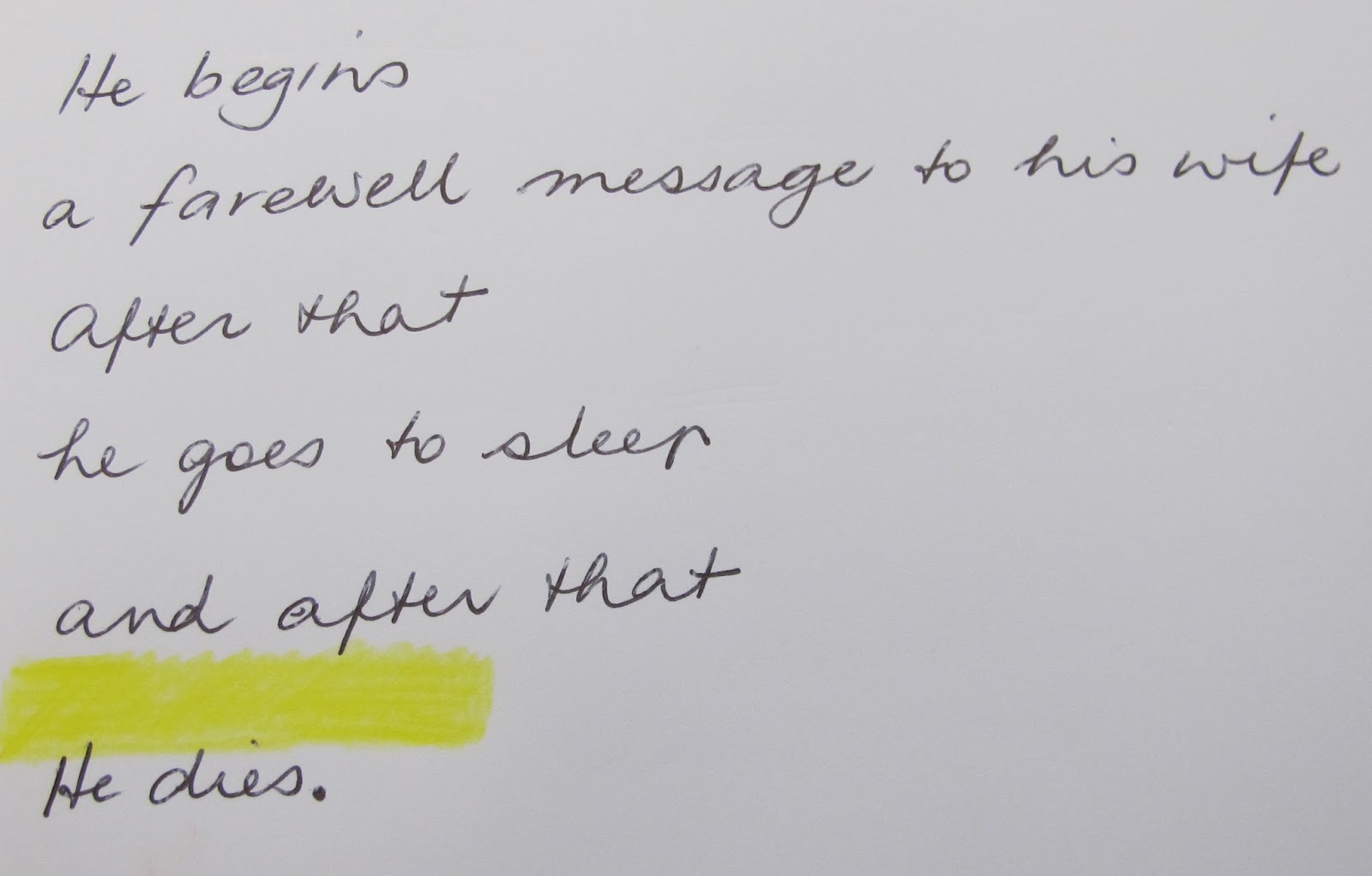I was given a page from one of Margaret Atwood’s novels. I have no idea which novel, but it was page 31-32. The task was to pull out a few words or a phrase and display it in poetic for—to create a poem from the prose.