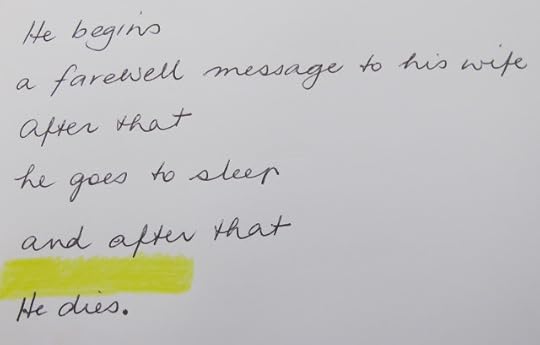 The words are not mine—they belong to Margaret Atwood. The arrangement is mine. I used time as the marker for the enjambment. I put the fullstop at the end to signify the finality of death. Apparently there’s more to analyse in that poem but I don’t know enough about poetry to understand it. That doesn’t stop me from enjoying writing and reading it.