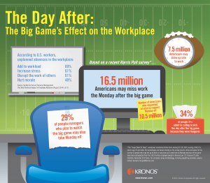 According to a survey commissioned by The Workforce Institute at Kronos, an estimated 16.5 million U.S. adults may miss work the day after the big game. What I found interesting was, of that number, 10.5 million will have planned the day off in advance. The rest are planning to call in sick on Monday morning.