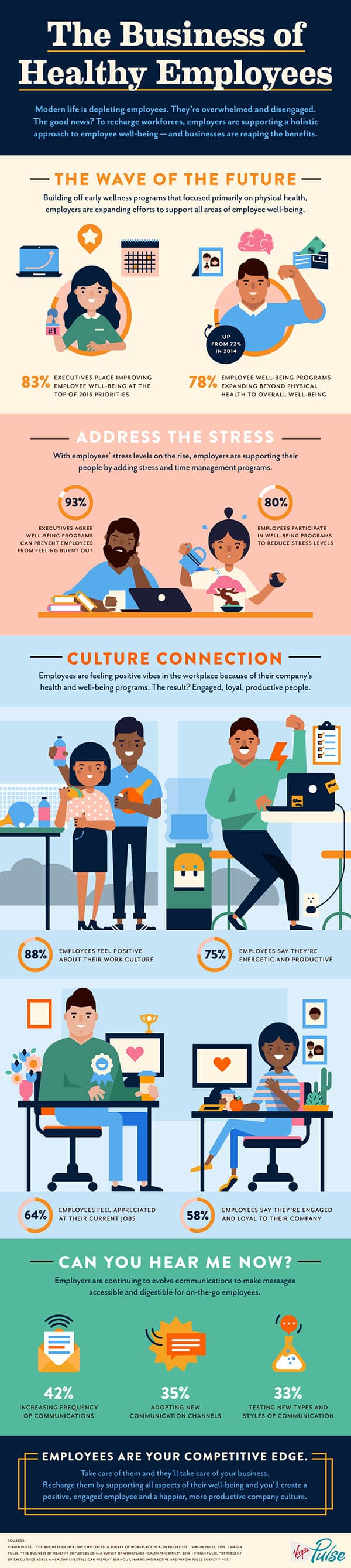 That’s the message in this infographic from Virgin Pulse, titled “The Business of Healthy Employees.” Creating a culture that values well-being makes sense for the company and its employees. Healthy employees bring their A-game to work every day.