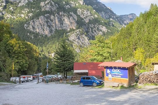 Either way, from Litochoro, it’s under 40 minutes by car to the town of Prionia, located at an elevation of 2,526 feet. If you’ve ridden in a car from Athens, you’ll find a parking lot right in Prionia. If you take a taxi from Litochoro to Prionia, the standard rate is 25 euros, or less than $28 at today’s exchange rate.