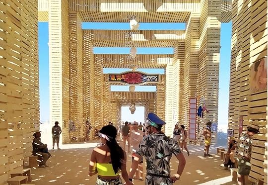 Geordie Van Der Bosch’s “Temple of Direction” is an Asian-temple-inspired space that provides a little time-out for Burners in need of peace and quiet, as well as shade. It is composed of several wooden, see-through square arches stacked behind each other to create a linear pathway whose width changes throughout.