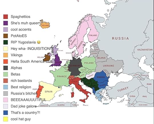 Americas might not have much luck correctly identifying parts of the UK, but maybe they’ll have better luck with Europe? Nope, not so much. This map, created by user uh-oh-spaghettios, paints a pretty interesting picture of the European continent. Switzerland is identified as “rich bastards,” Germany as “Alphas,” France as “Betas,” and the entire Balkan region as “RIP Yugoslavia.”