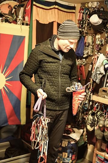 Conrad in his gear room prepping for the day’s climbing adventure. His gear room is his inner sanctum; it contains everything he’d need for an expedition to Antarctica, climbing Everest, or a day of ice climbing with a complete rookie in Hyalite Canyon. All the gear is meticulously organized, with Conrad’s favorite cartoons, news clippings, invitations, poems, art, and personal remembrances covering the walls.
