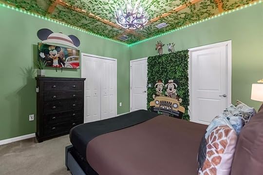 One of the best Kissimmee vacation rentals for multigenerational families, has a Moana-themed bunk room and a Mickey and Minnie’s Jungle Safari suite. The remaining rooms come with upholstered beds and private bathrooms. Gather downstairs to finesse your air hockey skills in the Star Wars games room or partake in Disney rewatches over popcorn in the movie theater. The screened-in patio has a pool and spill-over hot tub.