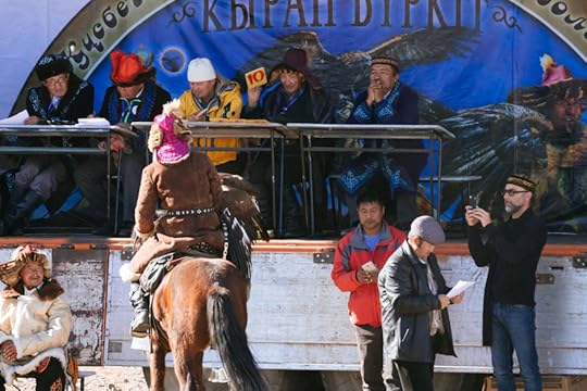 An eagle hunter faces the judges’ podium and receives a top score of 10 in the competition. Hunters are judged by how well-trained their eagles are.