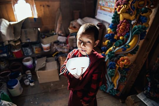 As a Buddhist kingdom, Bhutan hosts a population that is more than three-quarters Buddhist. The famous Buddhist master Padmasambhava is said to have meditated for three years, three months, three weeks, and three nights here in the 8th century. All monks in Bhutan, following their nine-year academic education (to Masters level in Buddhist philosophy) are obliged to then undertake the same three-year (or more) retreat before becoming teachers themselves. Many begin their training at very young ages; here, a young monk pops into the costume closet to try a few things on for the annual festival at the Gangtey Monastery.