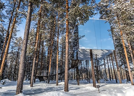 The Mirrorcube at the Treehotel blends in with its surroundings. This cubic tree house is covered in reflective glass to flow with the look of the landscape.