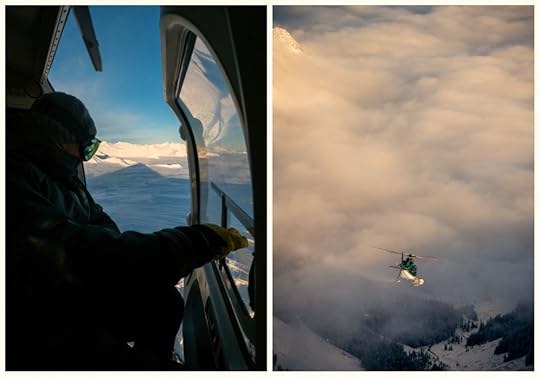 The Agusta Koala helicopter is a sleek Italian model that looks like it belongs more in a bank heist getaway than delivering skiers to alpine summits. The Koala holds six passengers and does sixty to eighty landings per day. The helicopter seems made for the high alpine environment - our pilot Gordie says the heli “climbs like a homesick angel.” I feel it’s going to be a good (and long) run when the shadow of the mountain I am heading to extends almost all the way to the opposite horizon.