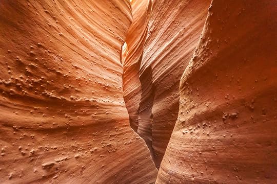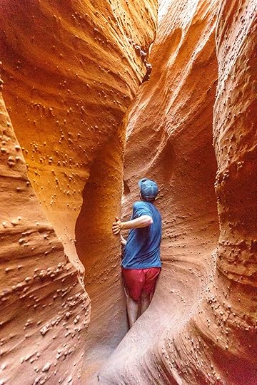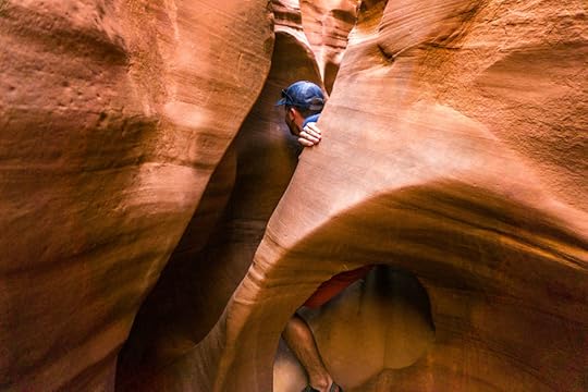 It’s quiet inside the canyon. As we move further along the path, we quickly find why it’s called a slot canyon. Doug crawls through a natural tunnel of rock that feels soft and cool to the touch.