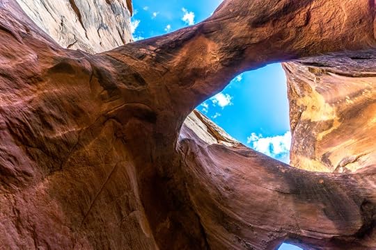 Rock formations flow around us, arching overhead and towering to our sides. These natural wonders allow sporadic peeks at the blue sky above, juxtaposing with the endless orange labyrinth of stone.