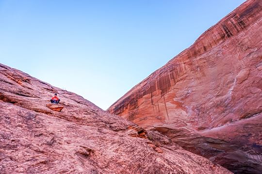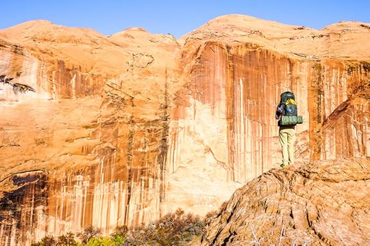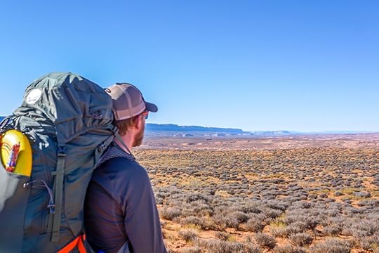 With a full pack, complete with Thanksgiving meals and a frisbee, Chris eyes the landscape. A world known as Coyote Gulch lies hidden among the red terrain before us.
