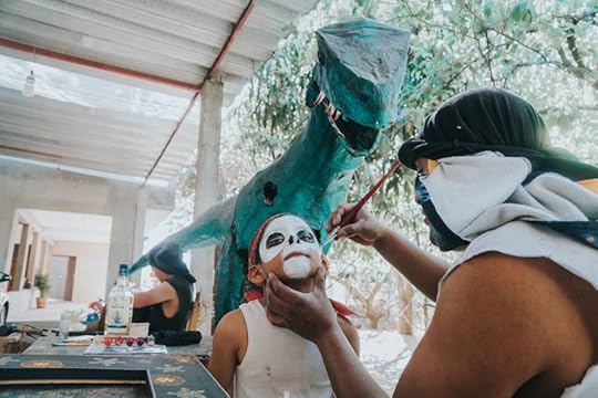 San Martin Tijacete is about 40 minutes outside of Oaxaca City, in a valley known for its artisans. This event is called Carnaval Ancestral, as it's not just regular Carnival: it's a blend of the Catholic tradition and the village's local traditions. In a town so close to Oaxaca City, where Day of the Dead is the pinnacle event of the year, it's no surprise that painting your face up like a skull is completely normal. Don't ask about the dinosaur - my Spanish is good, but not *that* good.