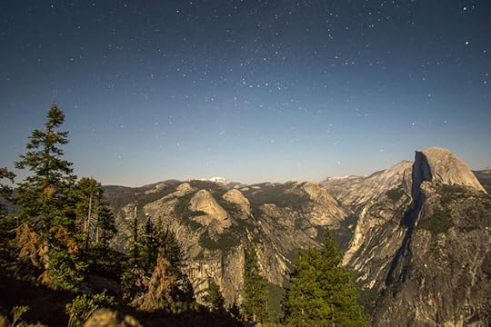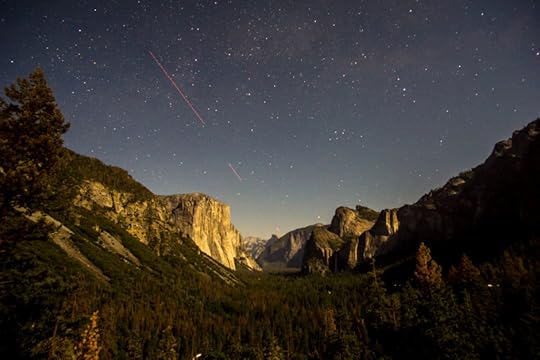 A dark, winding road carries us to where our day in Yosemite started. And here, we’re treated once again to a sweeping view of the valley, but this time there’s a sparkling sky above us.