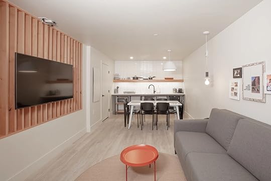 This Airbnb is across the river from downtown, a spacious 1500-square-foot home with vaulted ceilings. It has two bedrooms, two and a half bathrooms, and can comfortably sleep six people. The home features modern furniture and plenty of natural light. The kitchen is fully equipped with stainless steel appliances and all the necessary cookware. There is an open-concept dining area with an island and a table for six. The living room has a chaise lounge sofa, a TV, and board games. There is also a dedicated workspace with a high-speed internet connection.