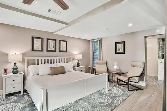 The master bedroom has a king-sized memory foam mattress and a full bathroom with a walk-in shower. The second bedroom also has a king-sized memory foam mattress and a full bathroom with a tub. Both bathrooms come with towels, toiletries, and a hairdryer. A washer and dryer are available for guest use. The backyard is well-manicured and has rocking chairs and furniture. Bicycles are also provided for free, but guests are responsible for their own safety while using them.