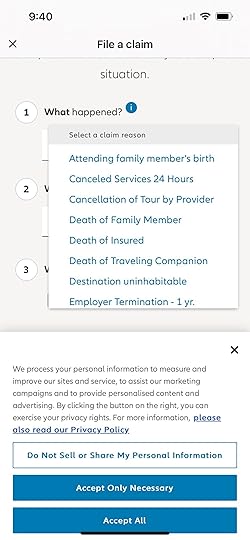 To file a claim, I clicked the button and selected my policy. I was then directed to a page that prompted me to enter the travel dates, destination(s), and other info about the trip, along with what happened. Importantly, it allows you to indicated whether something happened before leaving on the trip, or while already on the trip. I selected “Something happened before my trip,” and the app prompted me to select the “Trip Cancellation” insurance option.