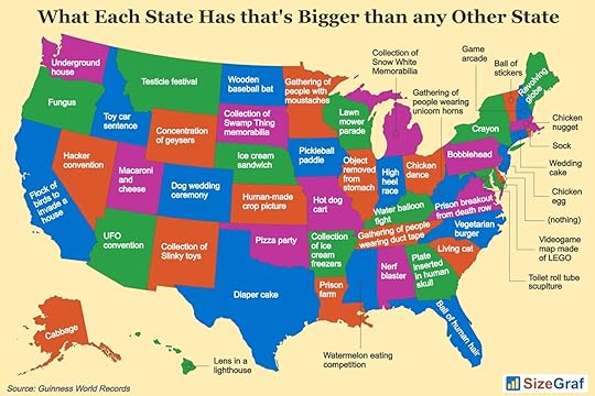If you’re looking for another boastful topic for an interstate rivalry debate, check out this hilarious map from SizeGraph. The site pulled information from the Guinness World Records to share the awards given for the biggest things in each state. These range from things you can be proud of, like trees, lakes, animals, and statues, to weird World Records, such as Florida’s claim to fame for the largest ball of human hair.