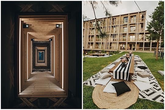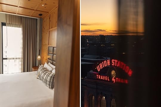 The modern exposed concrete in the rooms is warmed by pine headboards that wrap up one wall to cover the ceiling around the bed. In our corner room on the tenth floor, wood panels separated the hallway and bathroom from the sleeping area, the bed facing a window overlooking Denver Millennium Bridge.