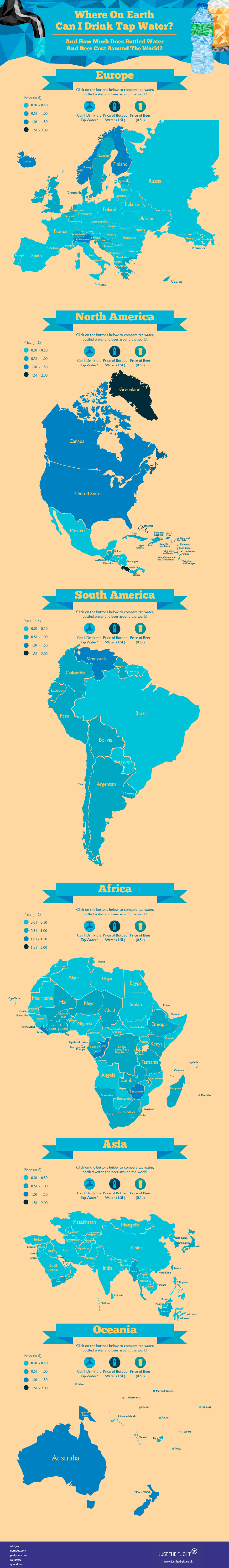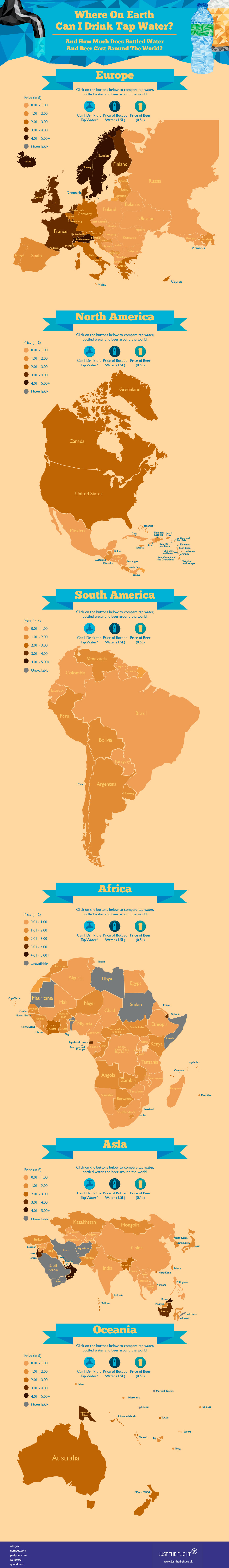YOU’VE HEARD IT BEFORE: “Don’t drink the water.” But it’s hard to keep track of where the water is safe and where it’s not. Sure, you know you’re supposed to avoid it while in Mexico and India, but where else is the tap water dangerous? Fortunately for us, Just the Flight put together this infographic breaking it down for every country. They’ve also broken down the price of beer and the price of bottled water by country for good measure. There’s a fully interactive version of this graphic on their website, but we’ve given individual graphics here.