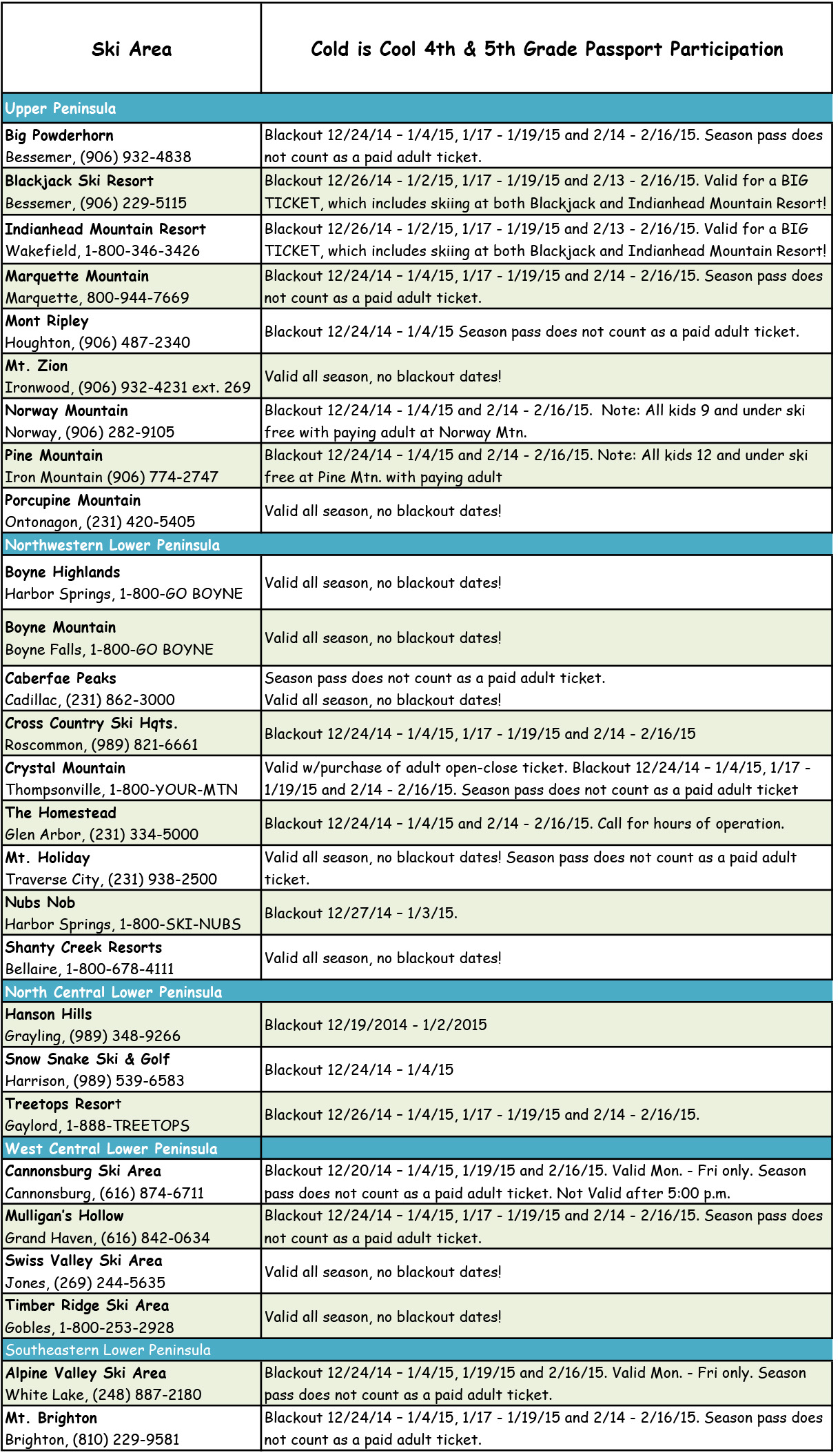 The Michigan Snowsports Industries Association (MSIA) wants to give Michigan kids an opportunity to get out, have fun and get healthy this winter. They established a state-wide program called Cold is Cool that provides every 4th and 5th grader in Michigan with a “passport” that gives them the opportunity to get on the slopes for free. Even homeschooled students who are at the 4th or 5th grade level can get up to three free lift tickets or trail passes at 27 participating ski areas, plus additional discounts on the slopes and in Michigan ski shops.