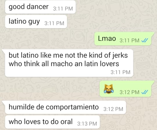 But jokes on you, buddy! I spent all night on Tinder looking for a smart, well-traveled, open-minded Latino from the hood who dances well and is skilled in the oral arts. And I think I have a couple promising leads.