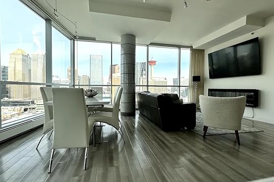 See more photosNo car is necessary at this modern sub-penthouse on the border of Beltline and the Calgary Design District. Wall-to-wall, floor-to-ceiling windows grant a stunning perspective of the metropolis. Pluck a book from the library and curl up on the couch on a wintery day or venture up to the seasonal rooftop terrace and befriend a Calgarian or two by the shared pool. It’s perfect for long-term stays.