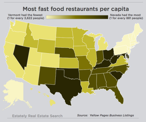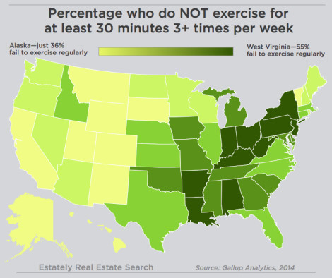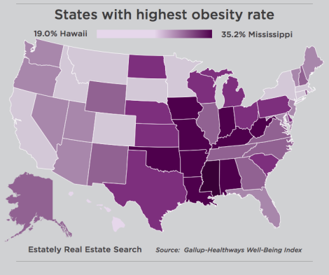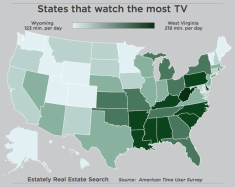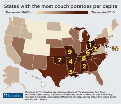 Yesterday, real estate search engine Estately published a series of US maps chronicling the top 10 US “couch potato” states. Yes, their findings may be riddled with excessive judgement and questionable statistics, but (taken with a grain of salt) the trends Estately found do offer some interesting insight into the general habits of the good ol’ US of A.