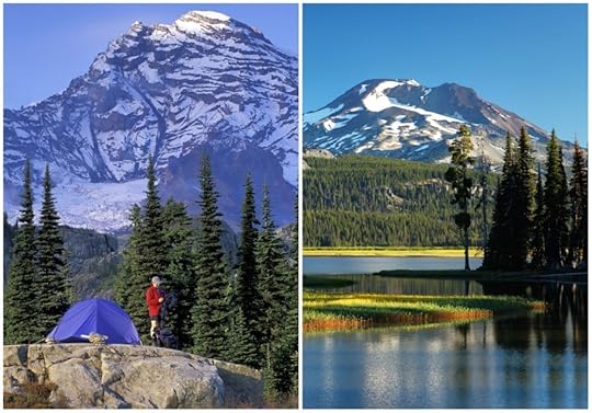 In the left photo, our tent is set up below 14,411 foot Mount Rainier on one evening of a 95-mile backpacking trip on the Wonderland Trail, which loops around the mountain. Mount Rainier National Park offers colorful wildflower meadows in August that turn crimson in October and then become ready for snowshoeing or backcountry skiing throughout the winter and spring. In the right photo, the smooth waters of Spark Plug Lake reflect the South Sister, another volcano in the central Oregon Cascade Mountains. This is just one of many surreal views you will find in this downright beautiful part of America. It's not hard to see why we're so proud to call it home.