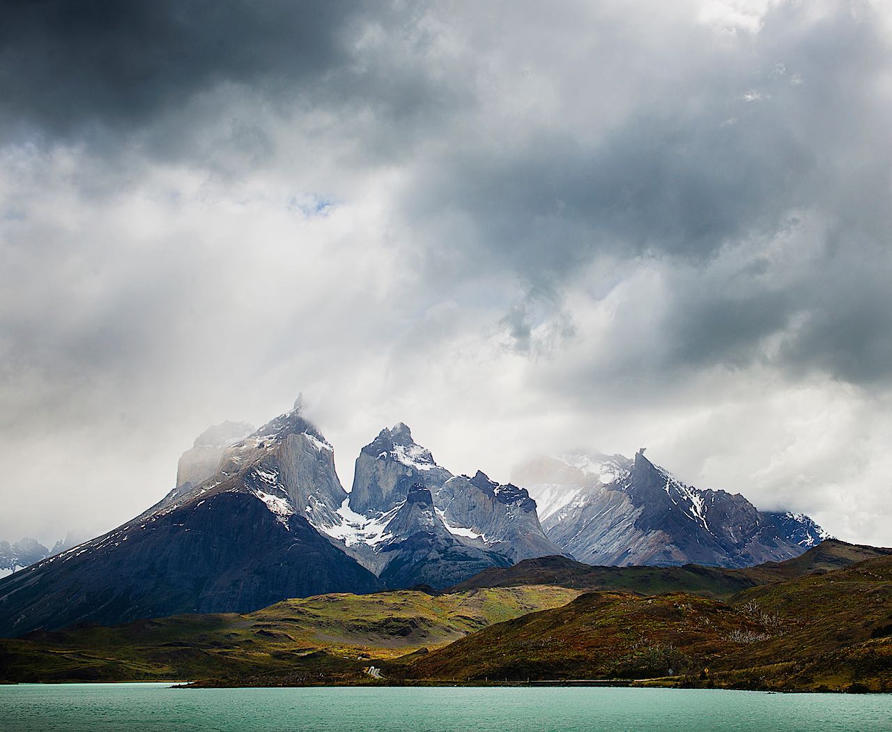 Macizo del Paine, the central massif of the park as seen from Lago Pehoé as we cross the waters.