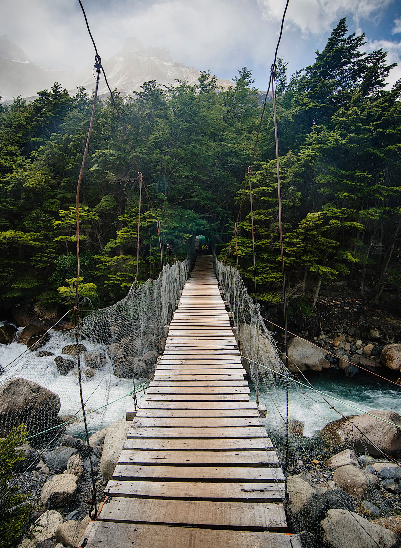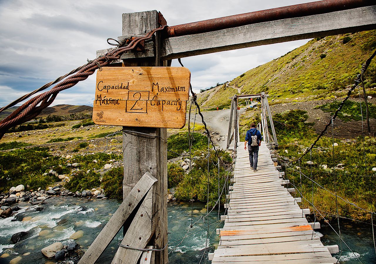 The somewhat fragile wooden suspension bridge sitting above the the Rio del Francés at the last leg of the days hike before Camp Italiano.