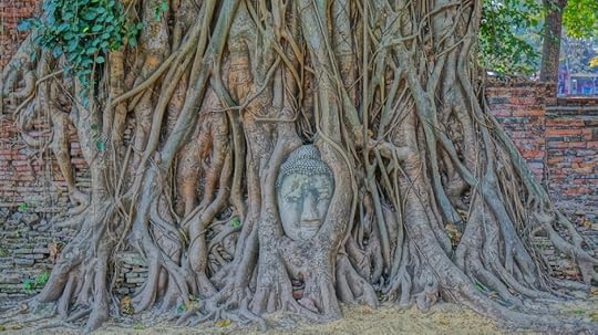 The sandstone head of Buddha looks serene in the roots of a banyan tree, though no one knows quite how the sculpture got there.