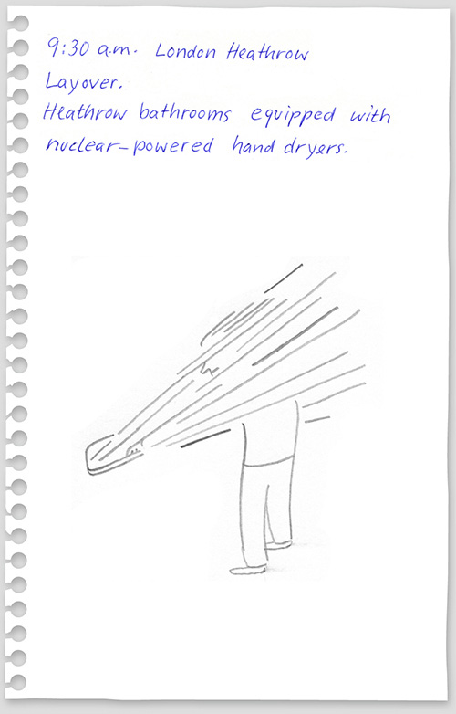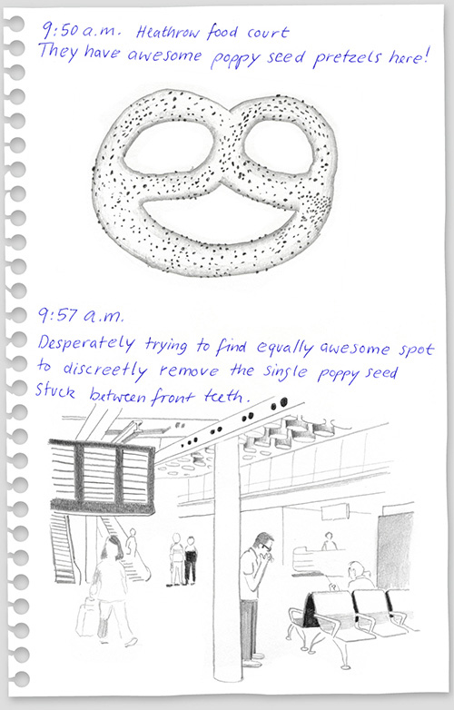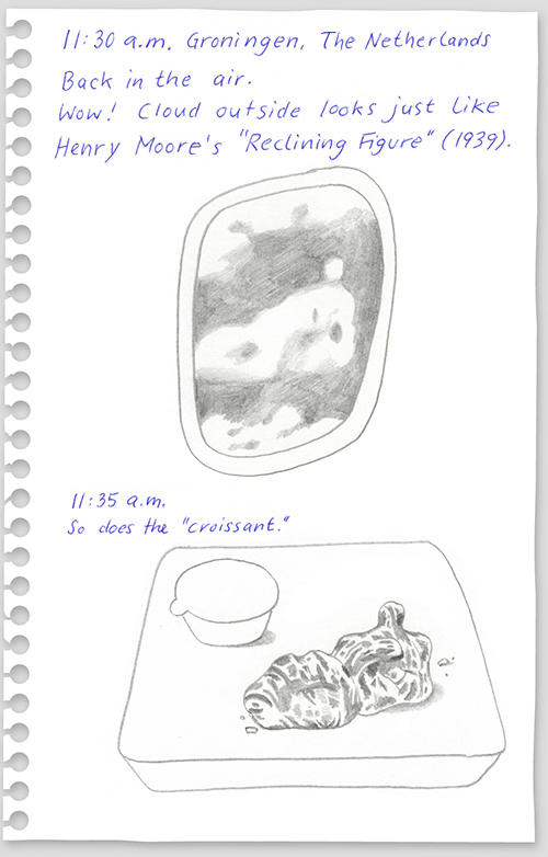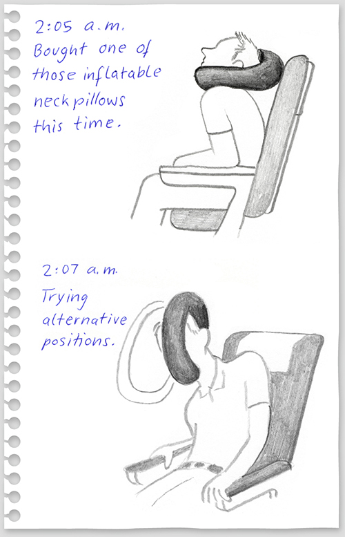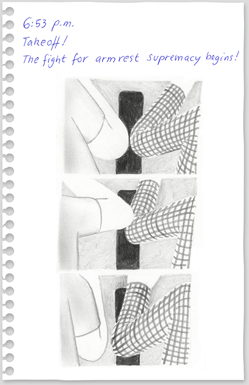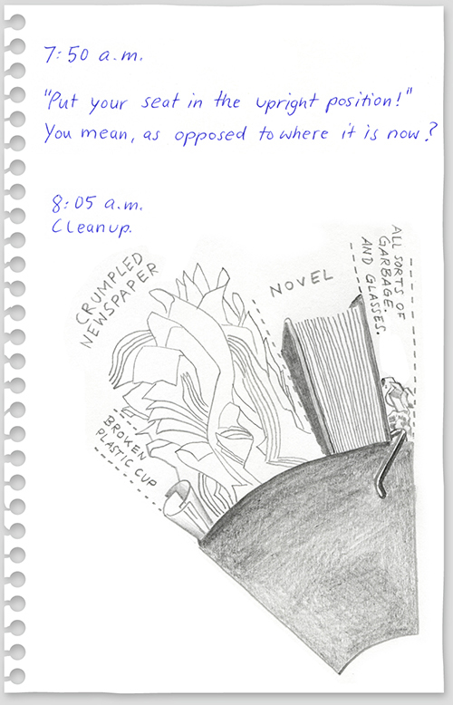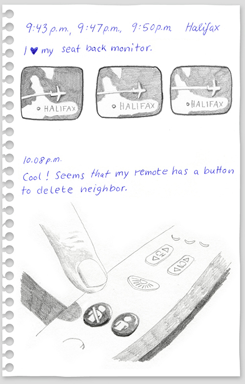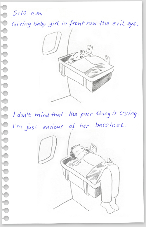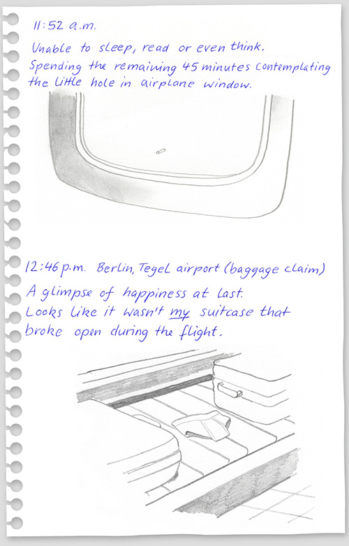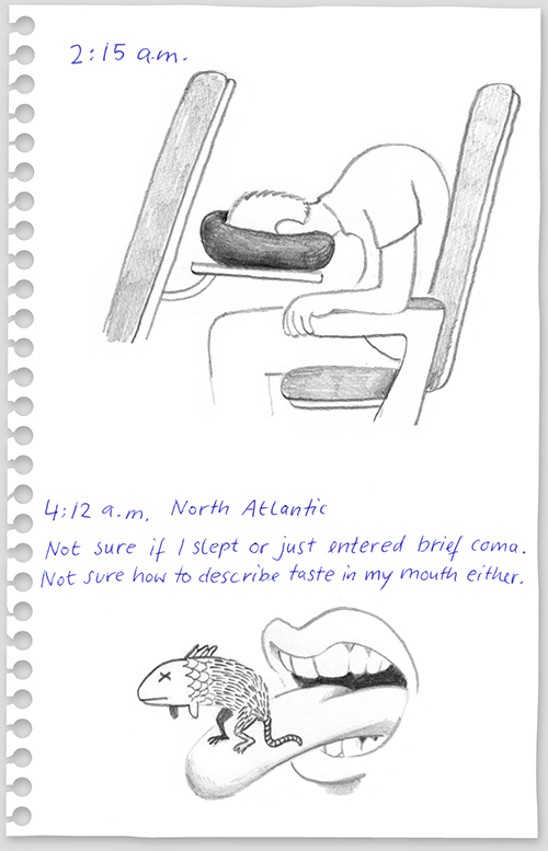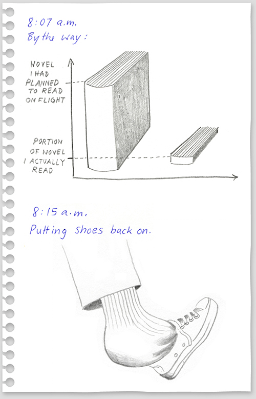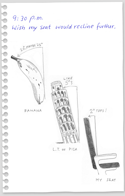 I RECENTLY BEGAN sketching during long-haul flights. It helps distract me when I feel anxious, and usually I’m pretty drunk during takeoff, so the things I produce in my journal are hilarious. But they can’t compare to the drawings of Christoph Niemann, who 100% captures what goes on in the minds of every single person who has ever flown from the East Coast of the USA, to Europe and beyond.